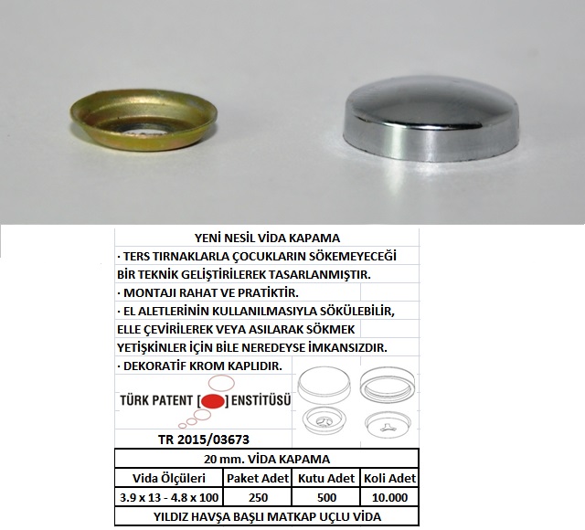 6- Firmamızın Üretmiş Olduğu Vida Kapama Dekoratif Krom kaplamadır. Patent - TR 2015/03673